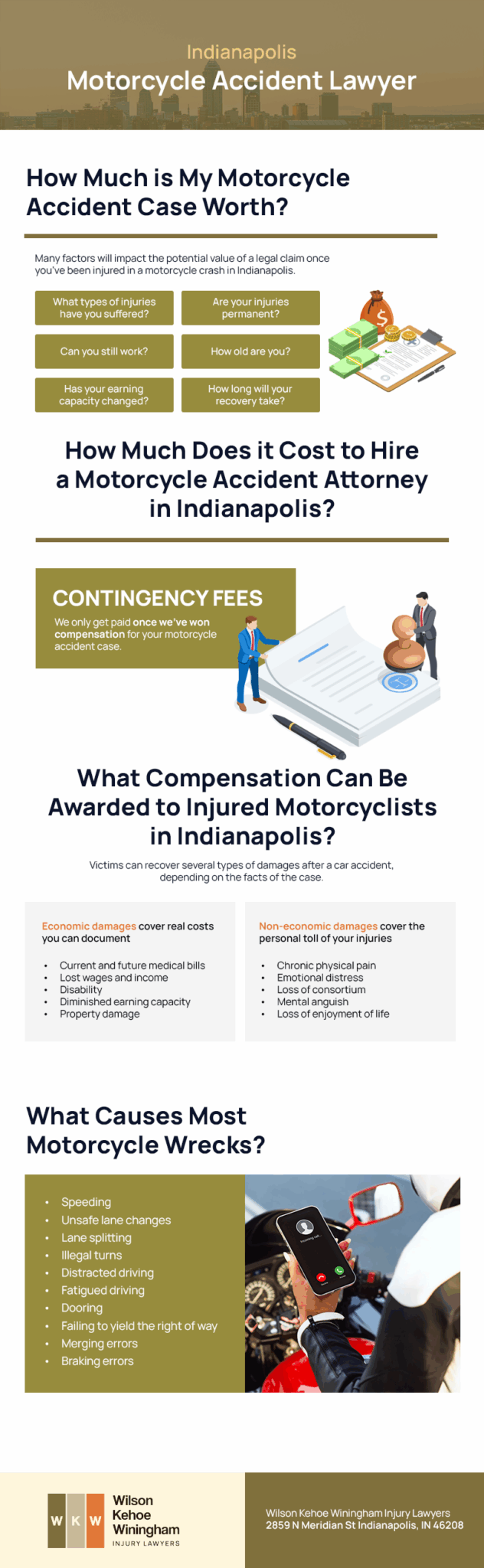 It depends. Many factors will impact the potential value of a legal claim once you’ve been injured in a motorcycle crash in Indianapolis.